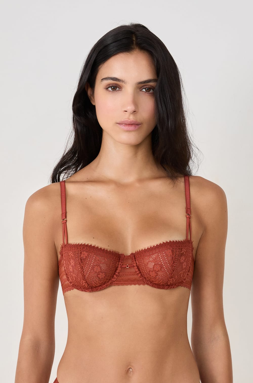 Dieser Balconette-BH ohne Schalen kombiniert florale Spitze mit Wimperneffekt und grafischen Streifen. Mit Bügeln ausgestattet, hebt er die Brust auf natürliche Weise, während die doppelten Träger vorne einen Hauch von Eleganz verleihen.