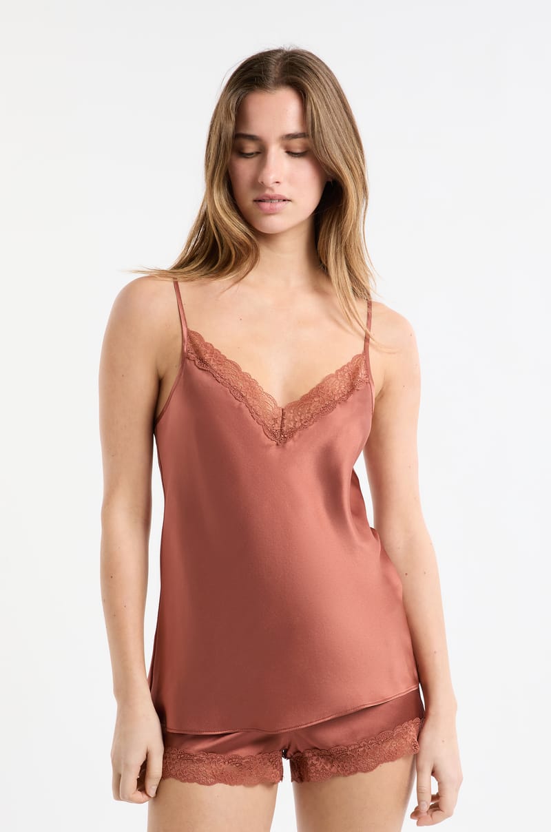 Zart mit geblümter Spitze verziert, kann dieses Trägertop sowohl im Alltag mit Jeans und Strickpullover als auch als raffinierte Nachtwäsche getragen werden.