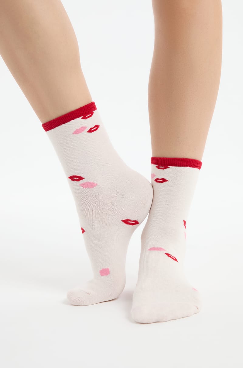 Confectionnées en coton, ces chaussettes sont munies d'un liseré uni contrasté et d'un imprimé bisous....