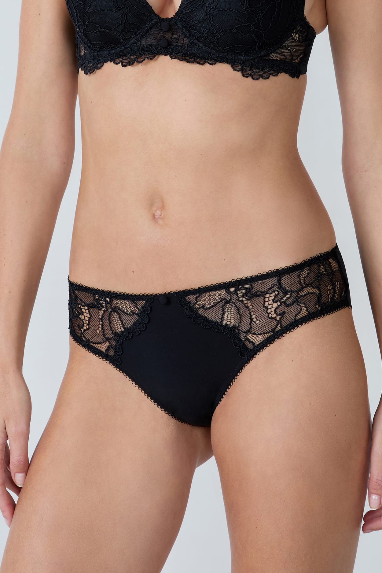 La dentelle se pare de motifs abstraits finement brodés sur cet hipster en bi-matière. Sa particularité ? Ses boutons ...