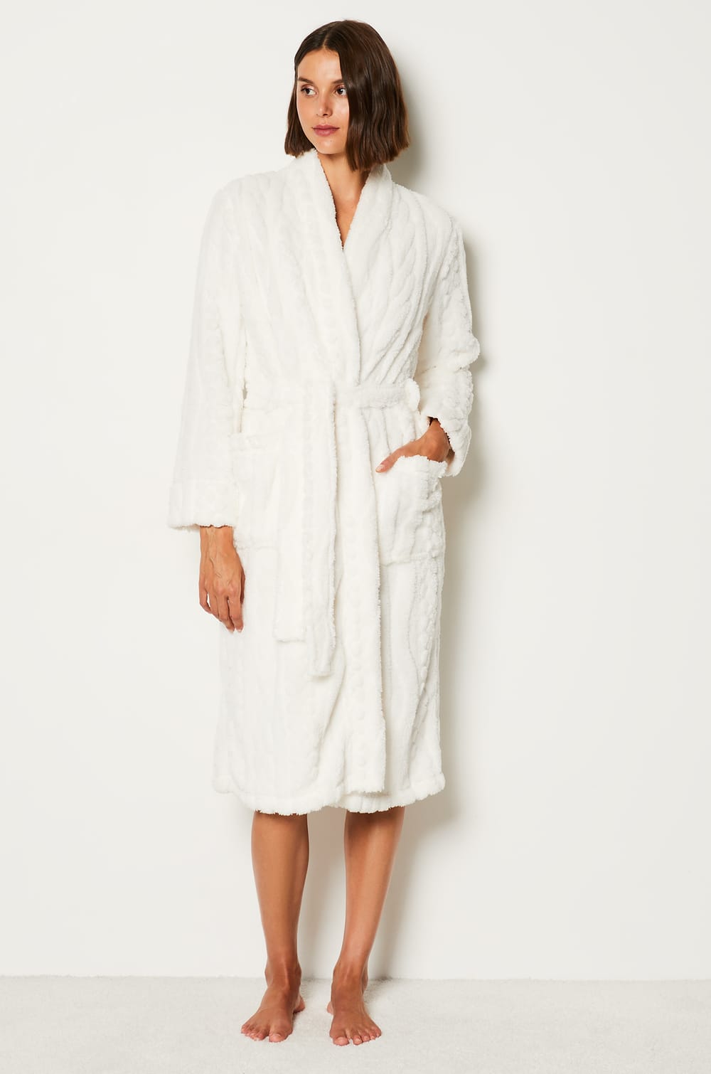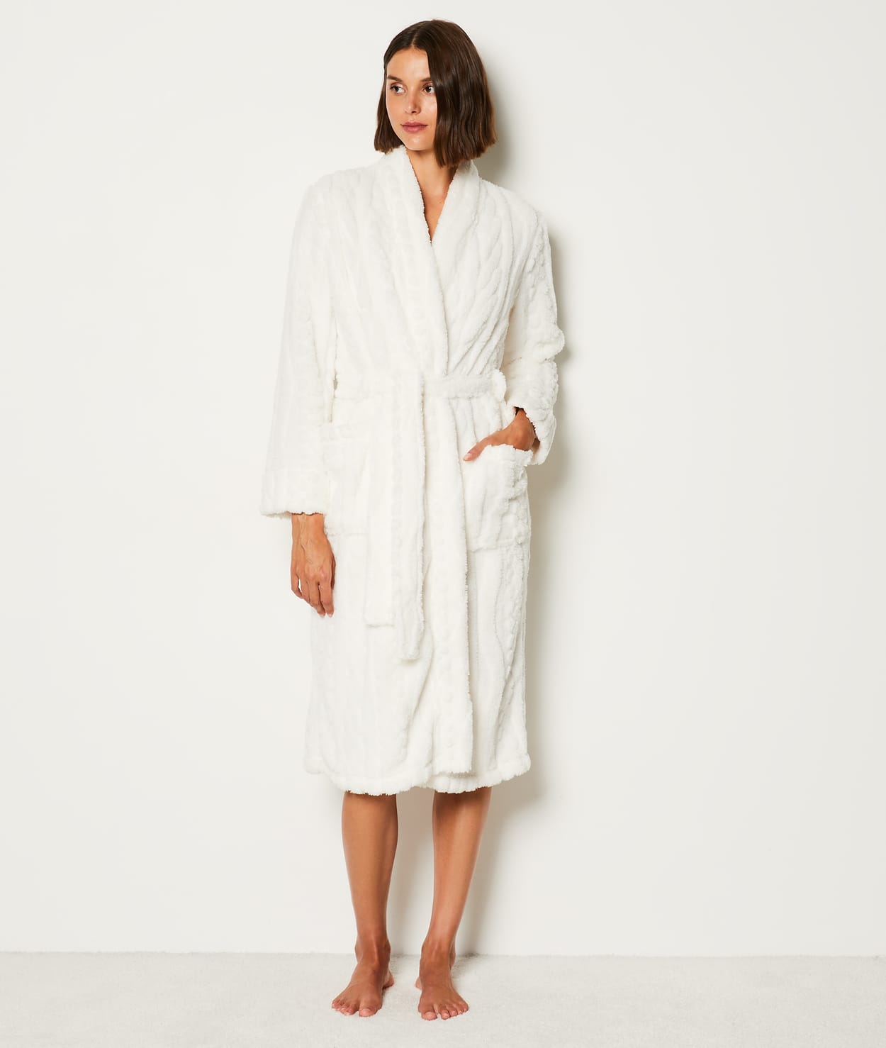 • Peignoir • Ceinture à nouer • Matière polaire • Encolure en V • Matière texturée • Manches longues