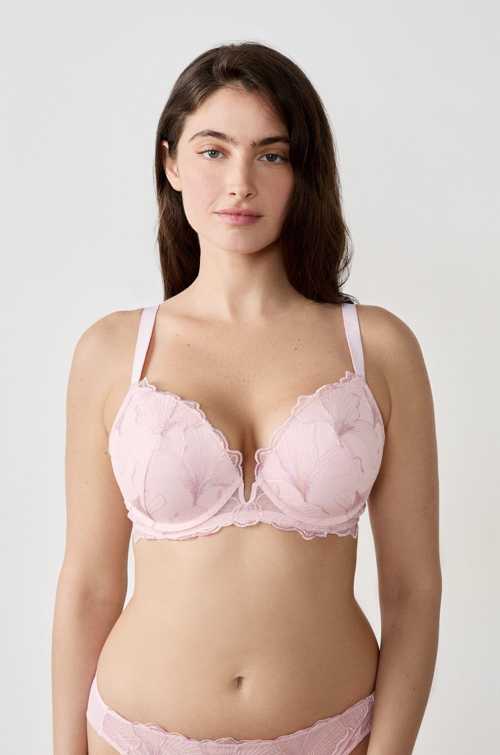 Notre expertise corsetière s’exprime avec précision dans ce soutien-gorge push-up plongeant, où la broderie florale se d...